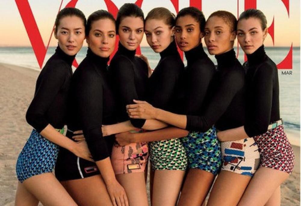 La foto che vi mostriamo è la copertina di Vogue Usa di marzo. Nell’immagine si vedono le sette super model del momento, tutte insieme, durante lo shooting fotografico sulla spiaggia di Malibu. Una copertina “multiculturale” con modelle di diverse origini, perché «in un clima di blocchi migratori e costruzioni di muri, i grandi nomi della moda dimostrano che non c’è un prototipo di donna americana e che non è mai esistito», come si legge su Vogue. Una velata accusa al neo Presidente Donald Trump probabilmente, con testimoni sette star d’eccezione: Liu Wen, Kendall Jenner, Vittoria Ceretti, Adwoa Aboah, Imaan Hammam, Ashley Graham e Gigi Hadid. Sette bellezze che però, almeno in questa foto, nascondono un dettaglio particolare. Osservate infatti il braccio di Gigi Hadid. La modella americana è al centro, la quarta da sinistra, e il suo braccio sinistro appare decisamente allungato, tanto che arriva sul fianco di Ashley Graham, la seconda da sinistra. Il dettaglio non è sfuggito ai più attenti che subito si sono chiesti «cosa è accaduto al braccio della Hadid?» L’intervento di Photoshop sembra sin troppo evidente. Secondo alcuni utenti maliziosi di Instagram l’”allungamento” del braccio della Hadid è stato fatto per far apparire la Graham più magra. Ma non solo: la modella curvy è l’unica che si copre la coscia con il braccio, dettaglio che sembra essere stato fatto apposta per “coprire” le curve generose della Graham. Quest’ultima inoltre è l’unica che indossa pantaloncini neri, e sembra che nella post produzione questi siano stati modificati aggiungendo una linea bianca verticale, sempre per farla apparire più magra.