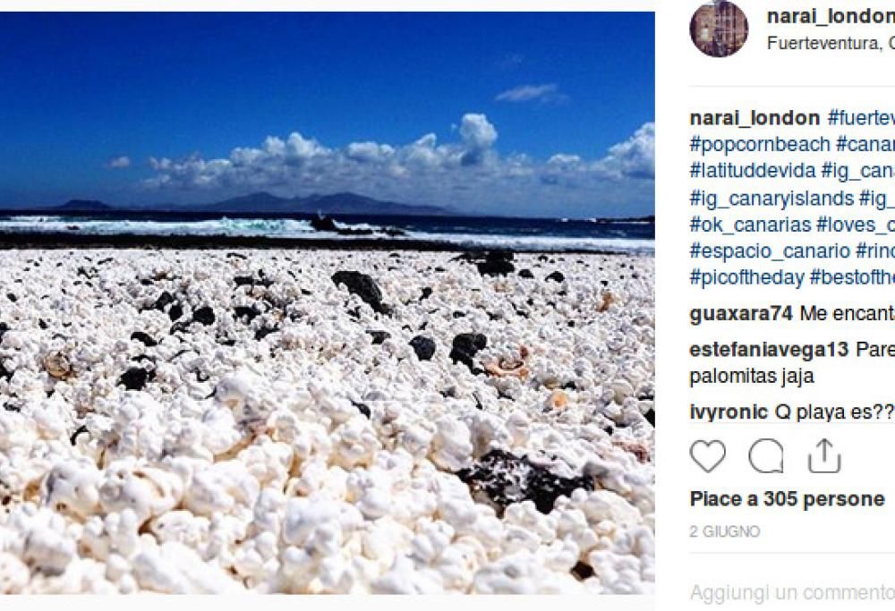 Diventata in poco tempo una celebrità su Instagram la “popcorn beach” è ormai un fenomeno mediatico e sono tantissime le foto che ritraggono i curiosi chicchi di mais scoppiati. Si tratta di un realtà di una miriade di frammenti di corallo bianco che sono stati portati dalle correnti sulla spiaggia, il risultato di centinata di migliaia di impatti con le scogliere che hanno sminuzzato i coralli che sono poi lentamente approdati a Corallejo.