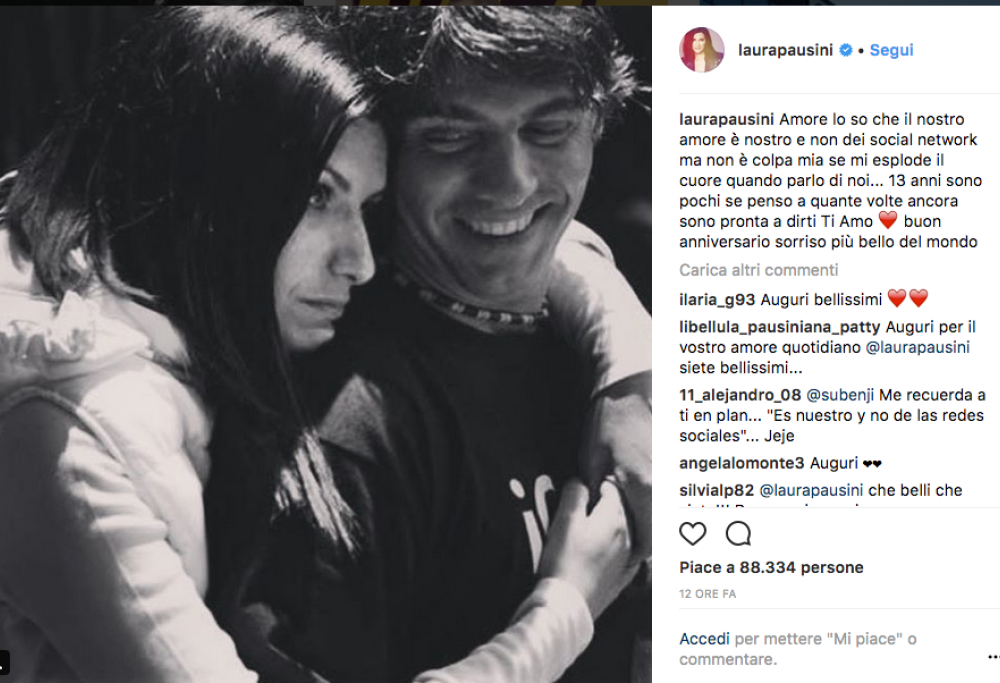 Laura ha anche accompagnato la foto con questo toccante post: «Amore lo so che il nostro amore è nostro e non dei social network ma non è colpa mia se mi esplode il cuore quando parlo di noi… 13 anni sono pochi se penso a quante volte ancora sono pronta a dirti Ti Amo ❤️ buon anniversario sorriso più bello del mondo».