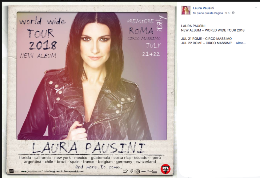 Il 2018 sarà un anno ricco di soddisfazioni per i fan di Laura Pausini. La cantante ha infatti annunciato su Facebook che l’anno prossimo pubblicherà il suo nuovo album e darà il via al suo tour mondiale. Le prime date saranno quelle di Roma, il 21 e 22 luglio allo Stadio Olimpico di Roma.
