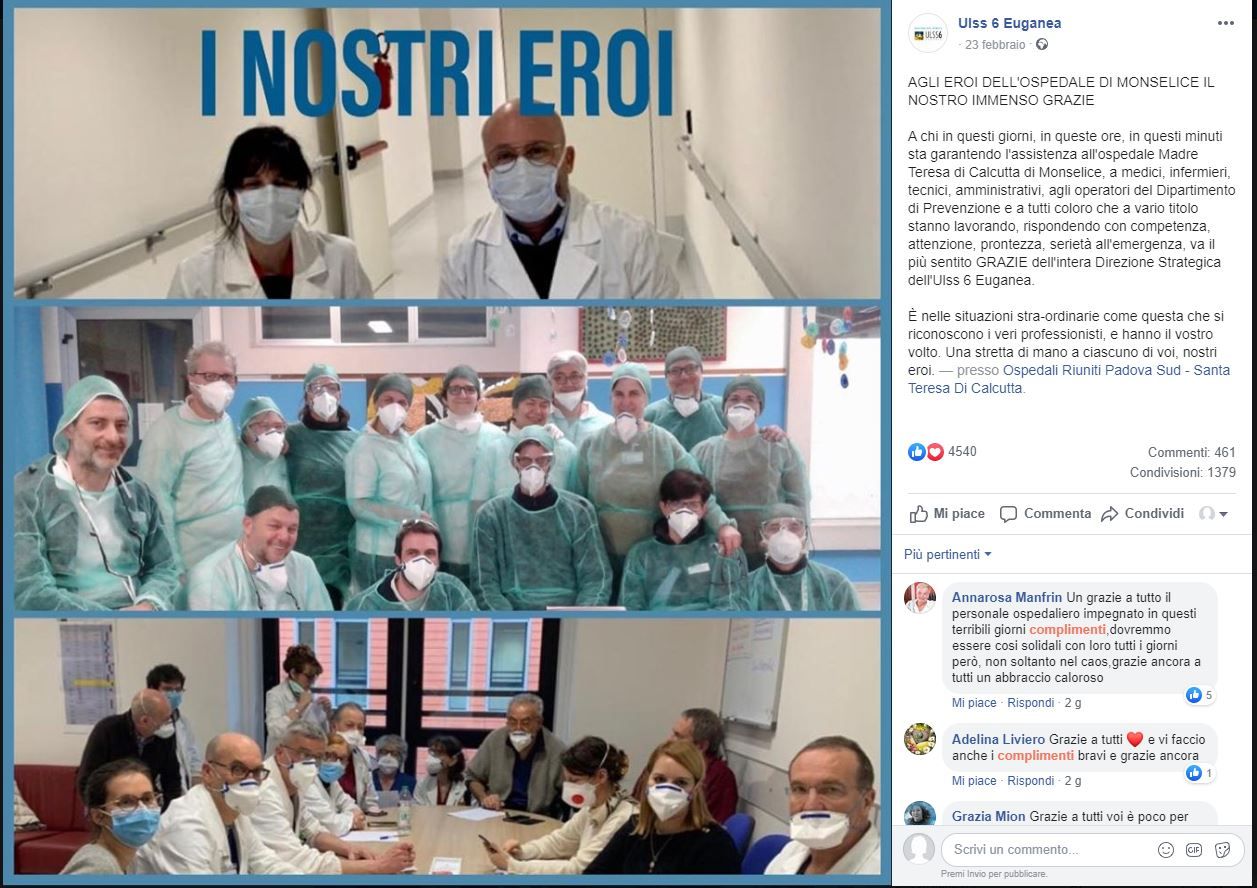 Ecco le parole colme di commozione del post: «A chi in questi giorni, in queste ore, in questi minuti sta garantendo l’assistenza all’ospedale Madre Teresa di Calcutta di Monselice, a medici, infermieri, tecnici, amministrativi, agli operatori del Dipartimento di Prevenzione e a tutti coloro che a vario titolo stanno lavorando, rispondendo con competenza, attenzione, prontezza, serietà all’emergenza, va il più sentito grazie dell’intera Direzione Strategica dell’Ulss 6 Euganea. È nelle situazioni straordinarie come questa che si riconoscono i veri professionisti, e hanno il vostro volto. Una stretta di mano a ciascuno di voi, nostri eroi».
