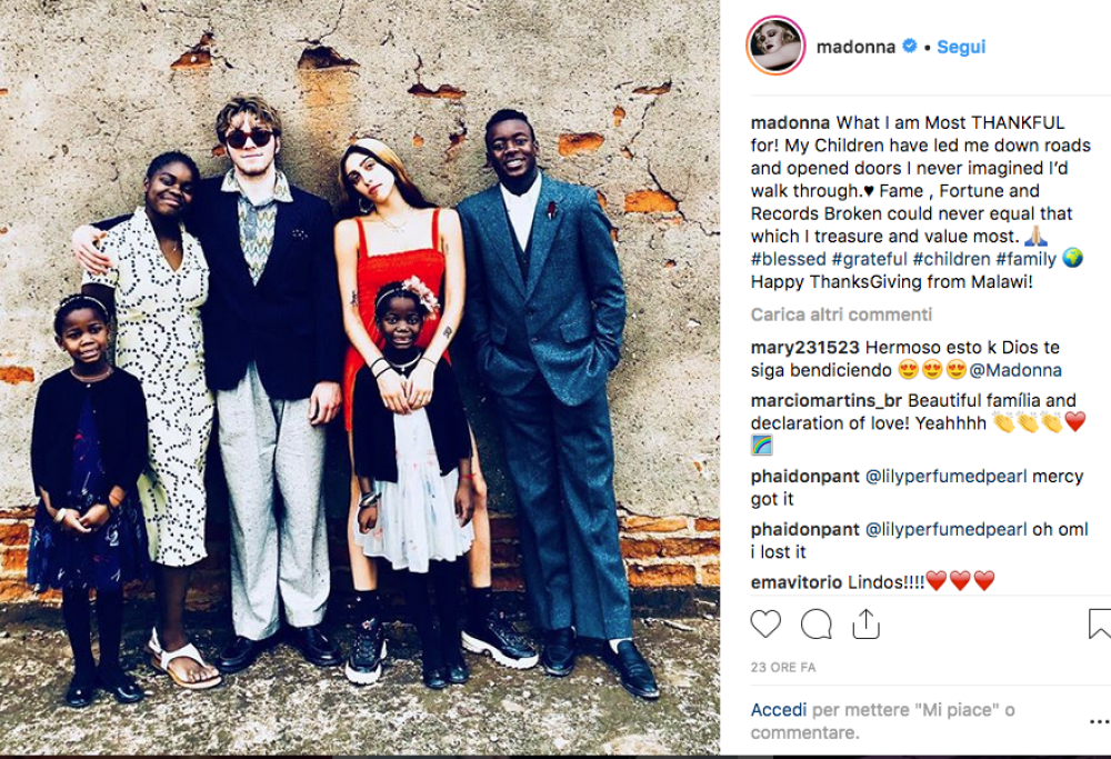Ad accompagnare l’immagine, le parole commosse di Madonna: «Ecco quello di cui sono più grata! I miei figli mi hanno aperto strade e porte che non avrei mai immaginato di attraversare. Fama, fortuna e record in classifica non potranno mai uguagliare questo, che per me è un tesoro e che ha un valore altissimo. Happy Thanksgiving dal Malawi!»