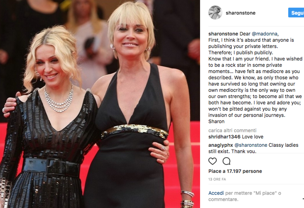 Sono naturalmente partite le polemiche in rete. A distinguersi per l’eleganza è stata però Sharon Stone, che ha postato sul suo account Instagram una foto che la ritrae con Madonna e un messaggio positivo: «Cara Madonna, prima di tutto penso che sia assurdo che qualcuno pubblichi le tue lettere private… Sai che sono tua amica. In alcuni momenti della mia vita, avrei voluto essere una rock star… mi sono sentita mediocre come dici. Noi sappiamo, come solo chi ha una lunga carriera sa, che tenersi saldi alla propria mediocrità è il solo modo per avere la propria forza. Per diventare quel che siamo diventate».