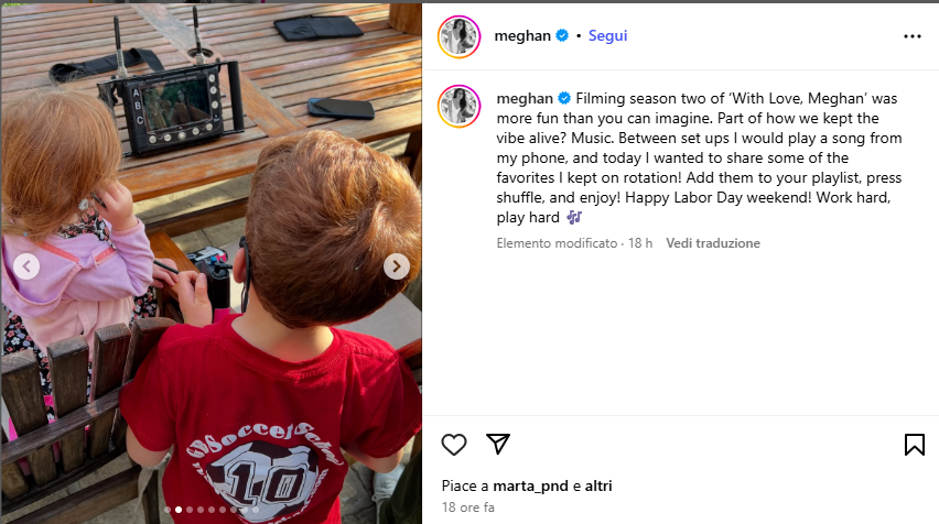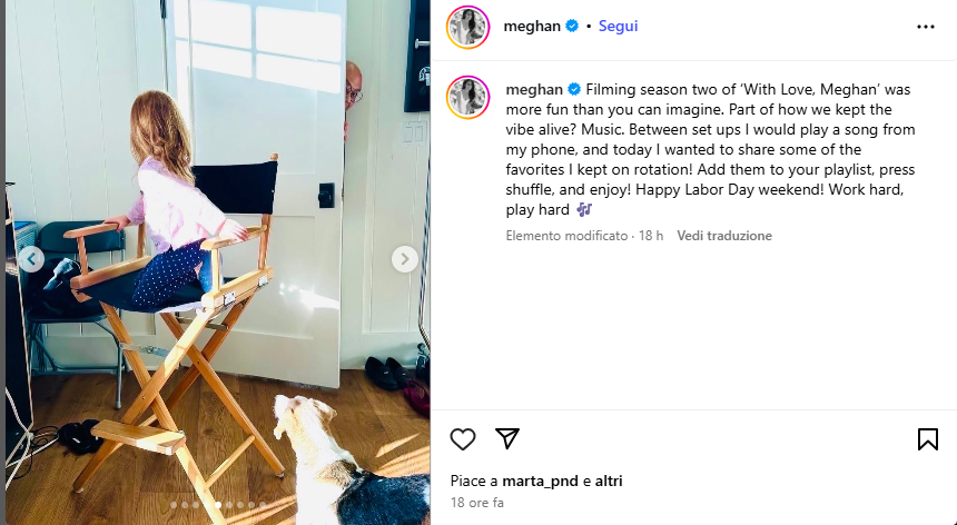 Il primo scatto reale vede i principini di spalle e mette in risalto la loro chioma rossa, uguale a quella del padre. L’altra immagine, invece, ha per protagonista la piccola Lilibet, intenta a girare su una sedia da regista con il beagle di famiglia ai suoi piedi. Ad accompagnare le fotografie ci sono le didascalie di mamma Meghan: “Le riprese della seconda stagione di With Love, Meghan, sono state più divertenti di quanto si possa immaginare. Parte del modo in cui abbiamo mantenuto viva l’atmosfera? Musica”, scrive la Duchessa del Sussex, con tanto di playlist di canzoni che hanno suonato sul set.