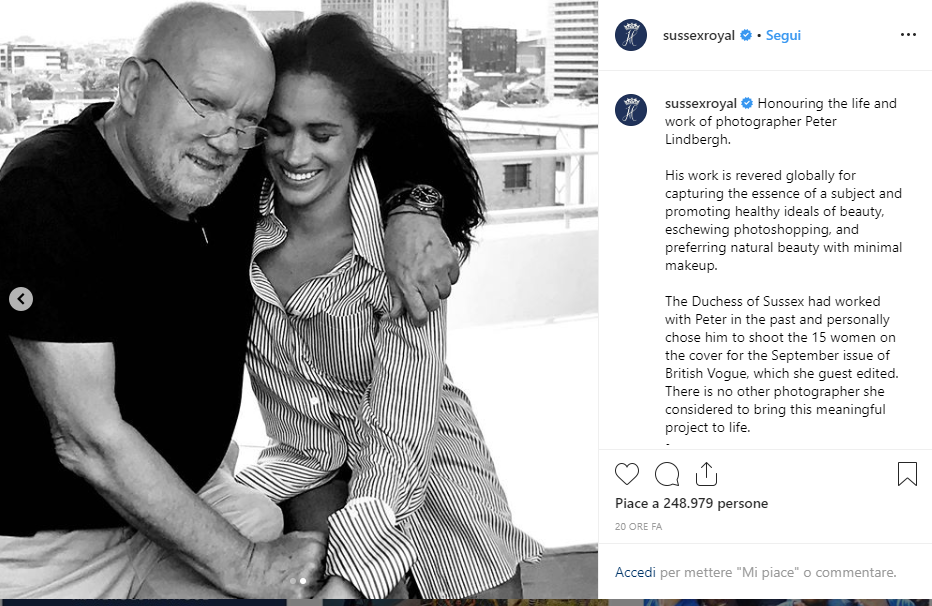 Il celebre fotografo di moda Peter Lindbergh è scomparso lo scorso 3 settembre e anche Meghan Markle lo ha ricordato pubblicando una bellissima foto sulla sua pagina Instagram ufficiale, SussexRoyal.