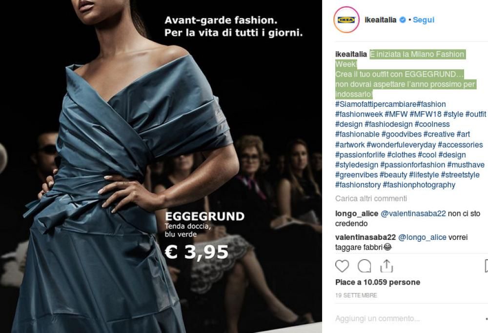 Sapete qual è stato l’abito più condiviso sui social durante la Milano Fashion Week? Una tenda da doccia! No, non vi stiamo prendendo in giro: merito dell’idea geniale è del social media manager di Ikea che proprio durante la MFW18 ha pubblicato sui social un post con la pubblicità della “Eggegrund”, una tenda doccia che per l’occasione è stata tramutata in abito da passerella. La didascalia recita: «È iniziata la Milano Fashion Week! Crea il tuo outfit con EGGEGRUND… non dovrai aspettare l’anno prossimo per indossarlo.»