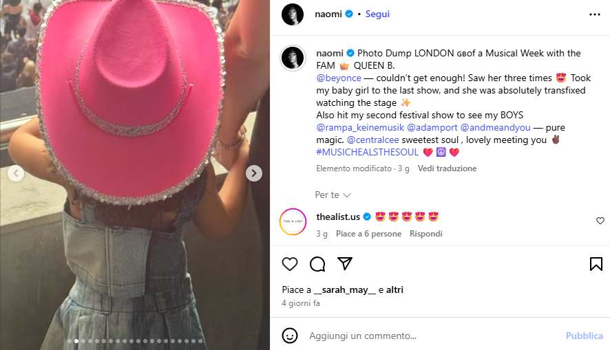 Beyoncé si sta attualmente esibendo in Europa, nell’ambito del suo Cowboy Carter Tour. “@beyonce — non ne ho mai abbastanza! L’ho vista tre volte. Ho portato la mia bambina all’ultimo spettacolo, ed è rimasta completamente incantata guardando il palco” ha scritto la supermodel, nella didascalia del suo ultimo post.