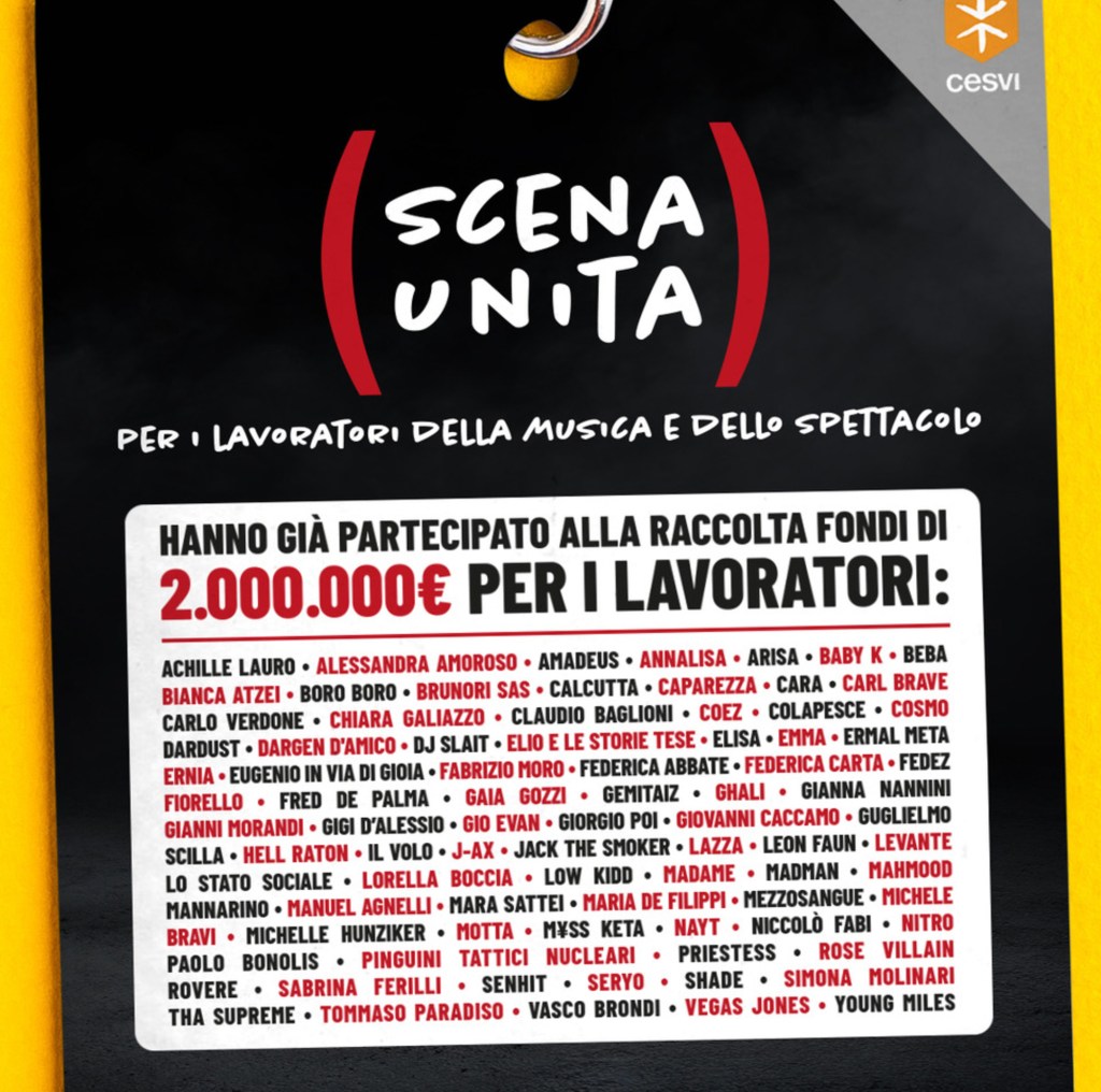 Per sostenere tutti i lavoratori del mondo dello spettacolo è nata “Scena Unita“, Fondo per i lavoratori della Musica e dello Spettacolo che sarà gestito da CESVI (organizzazione umanitaria italiana laica e indipendente) in collaborazione con La Musica Che Gira e Music Innovation Hub. A patrocinare l’iniziativa è il Mibact.