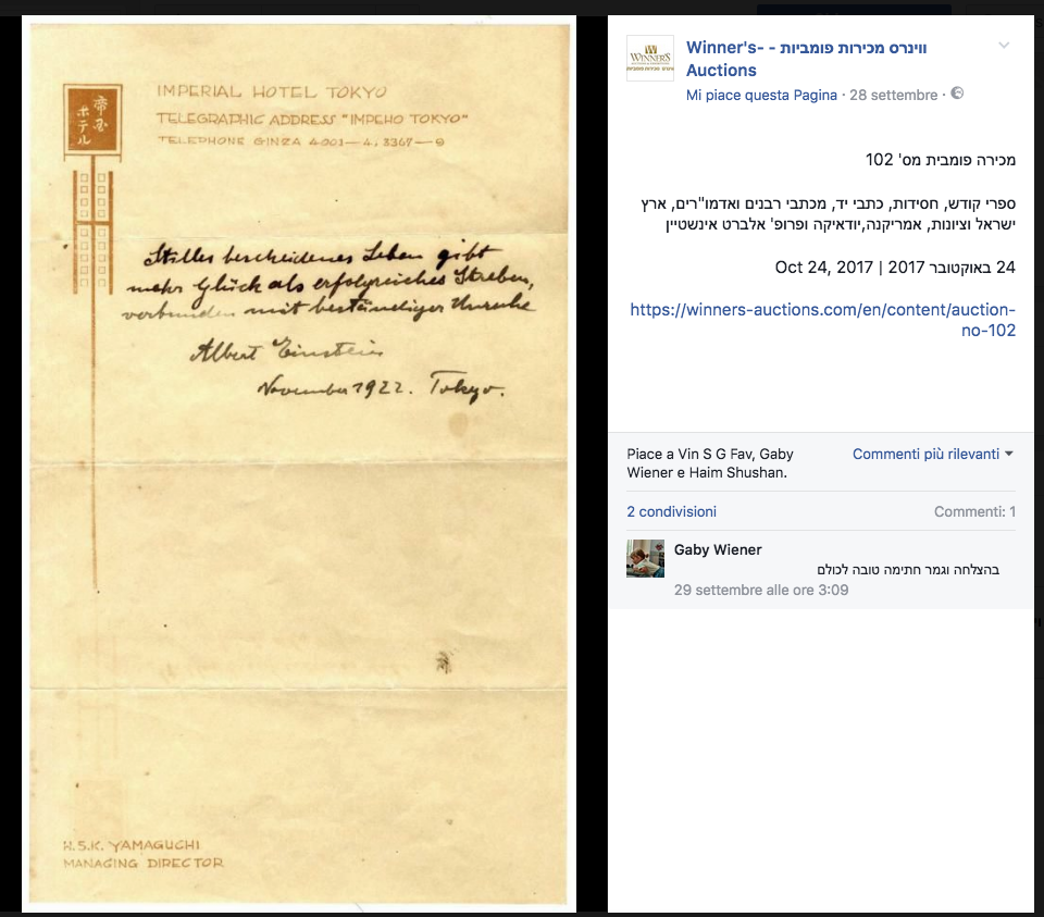 I biglietti furono scritti da Einstein nel 1922, in Giappone. Un fattorino aveva recapitato un messaggio allo scienziato, che alloggiava in un hotel di Tokyo. L'uso nipponico non prevede la mancia, ma Einstein volle lo stesso dare qualcosa al fattorino, così, sulla carta da lettera dell'hotel, scrisse: «una vita semplice e serena dà più gioia della ricerca di un successo frutto di un incessante malcontento» e poi: «là dove c'è un fermo proposito, c'è la strada per raggiungerlo».