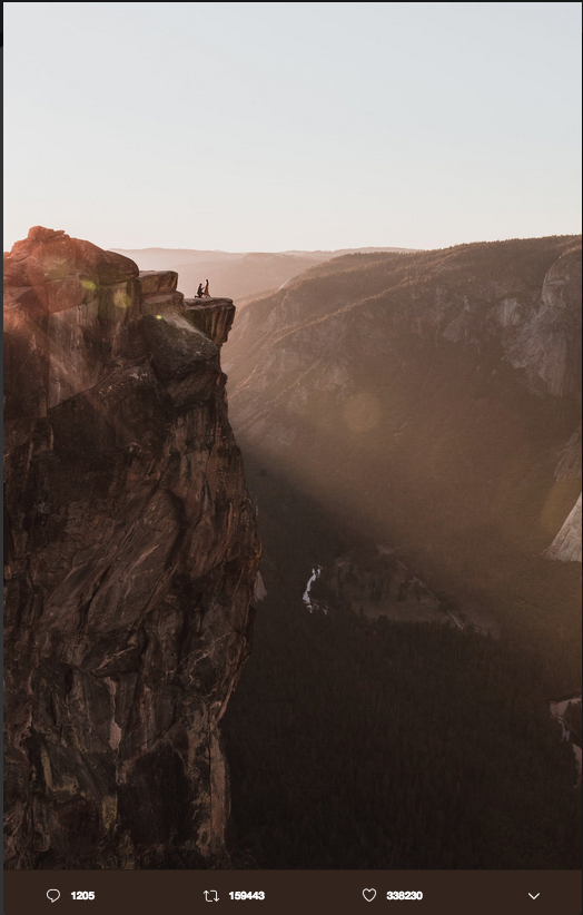 Matthew Dippel è un fotografo statunitense che ha scatenato una incredibile caccia virtuale sul web. Matthew ha infatti fotografato una coppia sorpresa a scambiarsi una promessa di matrimonio su una roccia a oltre 1000 metri di altezza, il Taft Point, nel parco di Yosemite, in California.