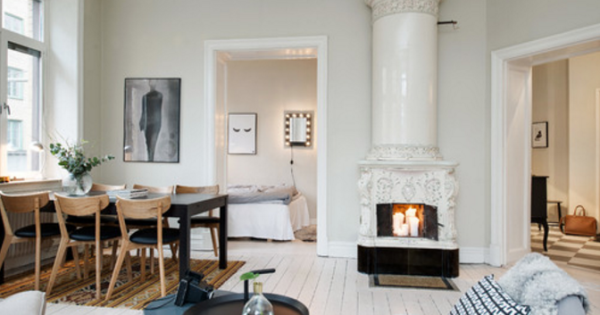 Ad esempio, in questo soggiorno svedese è stata fatta una scelta forte in favore della tinteggiatura bianca, unificando le cornici delle porte, i decori a soffitto e la bellissima stufa a legna. Per le pareti invece la tonalità di bianco scelta si discosta leggermente, poiché sporcata con una punta di verde – rendendo tutto l’ambiente molto più interessante rispetto ad un bianco puro che non ne avrebbe evidenziato i dettagli.