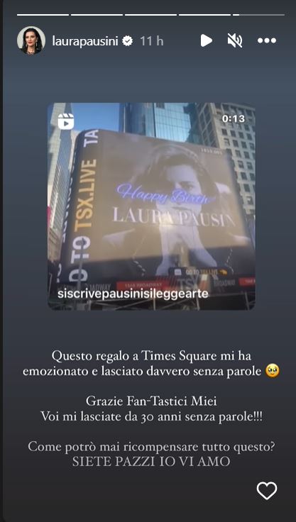 La Pausini ha poi condiviso nelle sue storie la clip di di un'istallazione che i fan hanno fatto realizzare a New York in suo onore. I fan hanno scritto: "Buon compleanno Laura, sei il nostro orgoglio italiano nel mondo".
