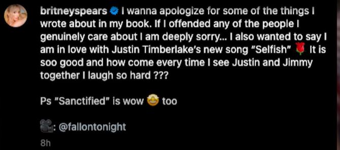 Britney è allora intervenuta a difesa di Justin, scrivendo: "Voglio chiedere scusa per alcune cose che ho scritto nel mio libro. Se ho offeso una delle persone a cui tengo veramente sono profondamente dispiaciuta. Volevo anche dire che sono innamorata della nuova canzone di Justin Timberlake, Selfish".