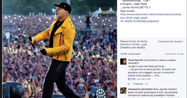 Gli stadi del 2018 sono in via di programmazione, non si sa ancora quanti saranno (…come minimo 7..) e dove, ma di sicuro saranno dei ritorni importanti …Per saperne di più, rimanete sintonizzati….sulla pagina facebook di Vasco».