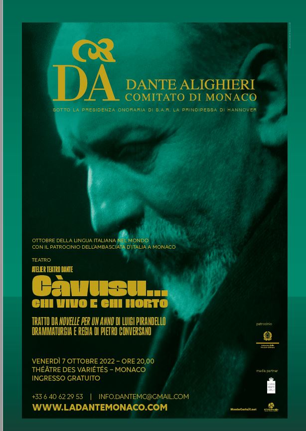 Ottobre è il mese della Lingua italiana nel mondo e per l'occasione la Società Dante Monaco ha organizzato lo spettacolo “Càvusu: chi vivo e chi morto”. L'appuntamento è per venerdì 7 ottobre 2022 al Théâtre des Variétés di Monte Carlo.
