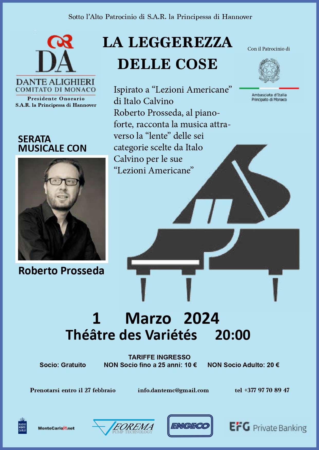 L'Associazione Dante Alighieri - Comitato di Monaco presenta, sotto l'Alto Patrocinio di S.A.R. la Principessa di Hannover e con il Patrocinio dell'Ambasciata d'Italia nel Principato, venerdì 1 marzo 2024 al Théâtre des Variétés di Monaco alle ore 20, lo spettacolo musicale: “La leggerezza delle cose” del pianista Roberto Prosseda, ispirato alle “Lezioni americane” di Italo Calvino.