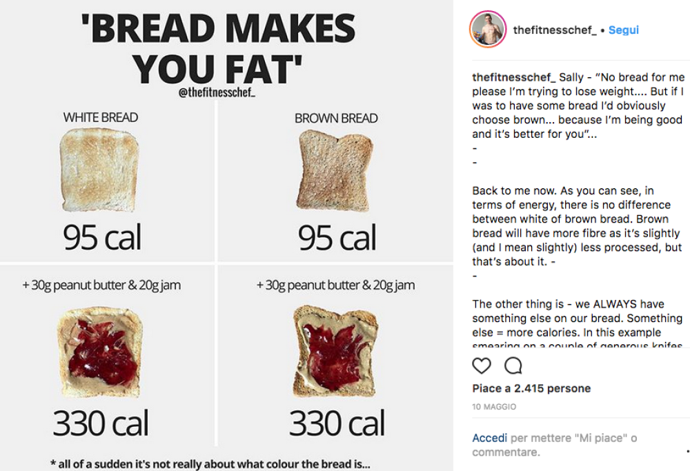 Siete amanti del pane e soffrite all’idea di dovervene privare in vista di una dieta? Allora abbiamo la foto che fa per voi. Guardate infatti quest’immagine, tratta dalla pagina Instagram di The Fitness Chef, personal trainer che on line si dedica a elargire consigli nutrizionali tutt’altro che scontati.
