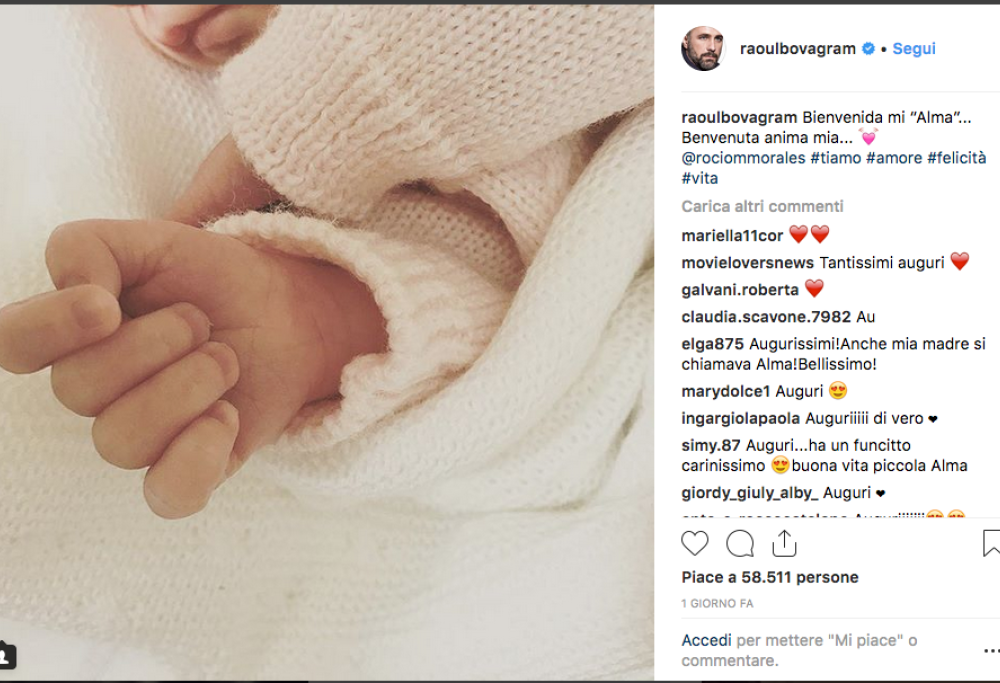 Raoul Bova e Rocio Morales hanno pubblicato sulle rispettive pagine Instagram la prima foto della loro seconda nata: la piccola Alma.