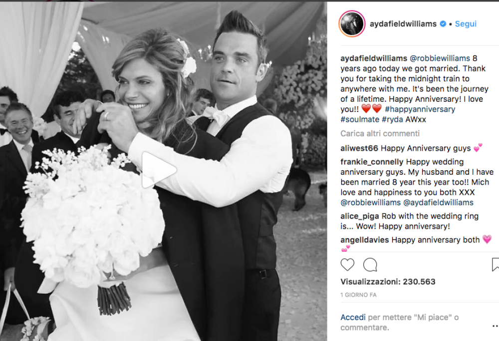 Per celebrare l’anniversario di matrimonio, Ayda ha pubblicato sui social una foto del matrimonio con Robbie, con questa affettuosa didascalia: «8 anni fa ci siamo sposati. Grazie per aver preso ovunque il treno di mezzanotte, insieme a me. È stato il viaggio di una vita. Felice anniversario! Ti amo!!»