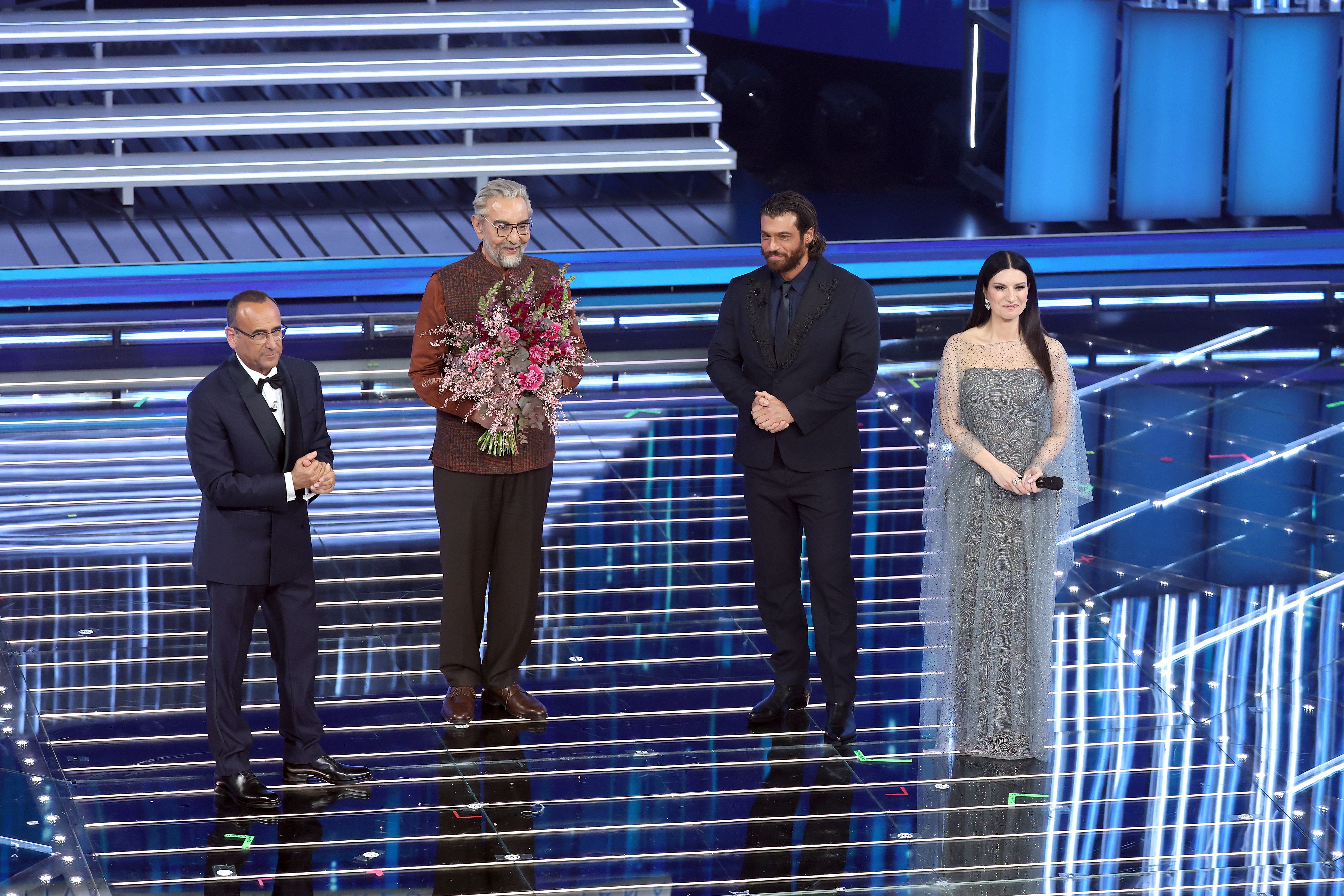 SANREMO, ITALY - FEBRUARY 24: Carlo Conti, Kabir Bedi, Laura Pausini and Can Yaman attend the 76th Sanremo Music Festival 2026 at Teatro Ariston on February 24, 2026 in Sanremo, Italy. (Photo by Daniele Venturelli/Getty Images)