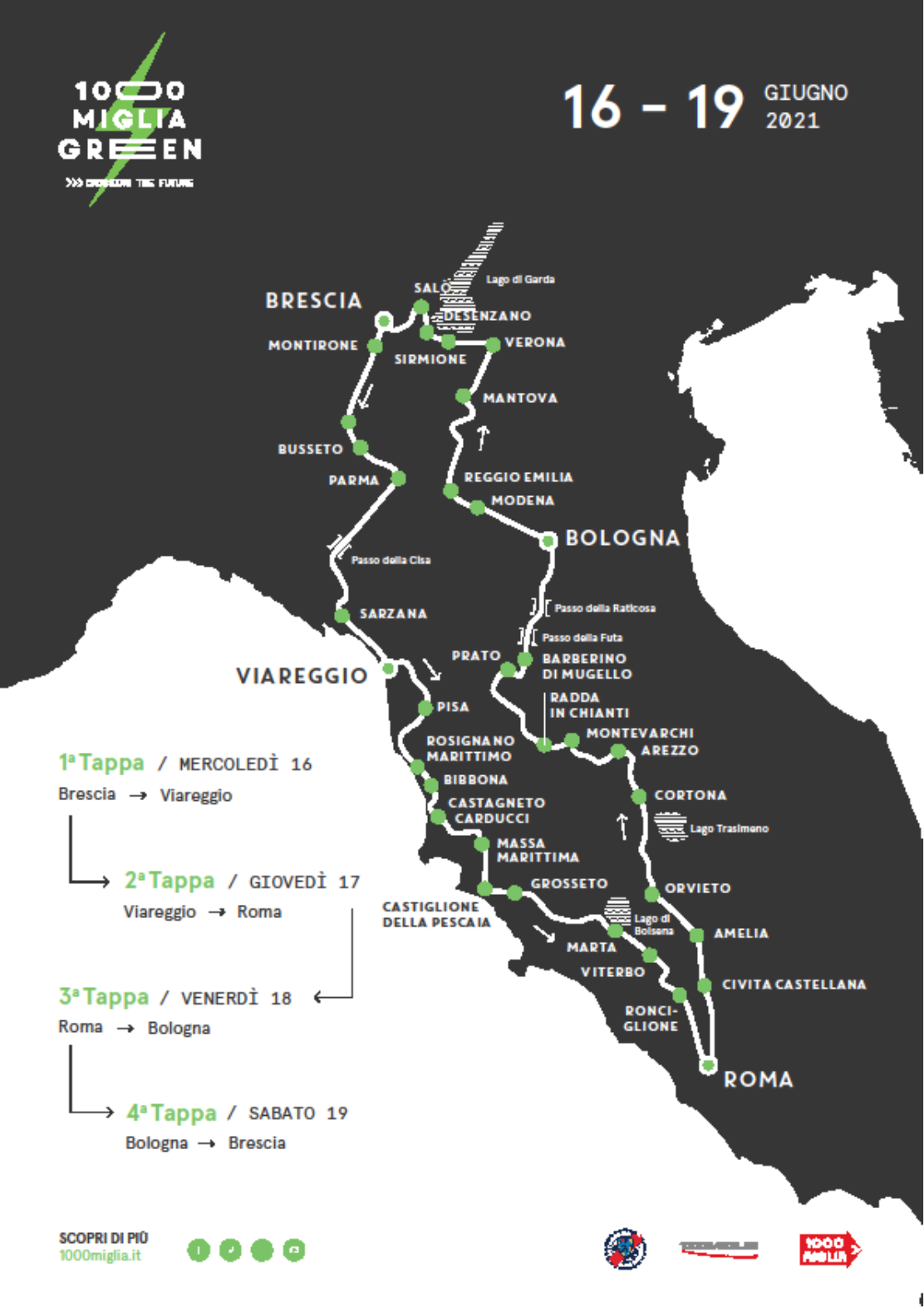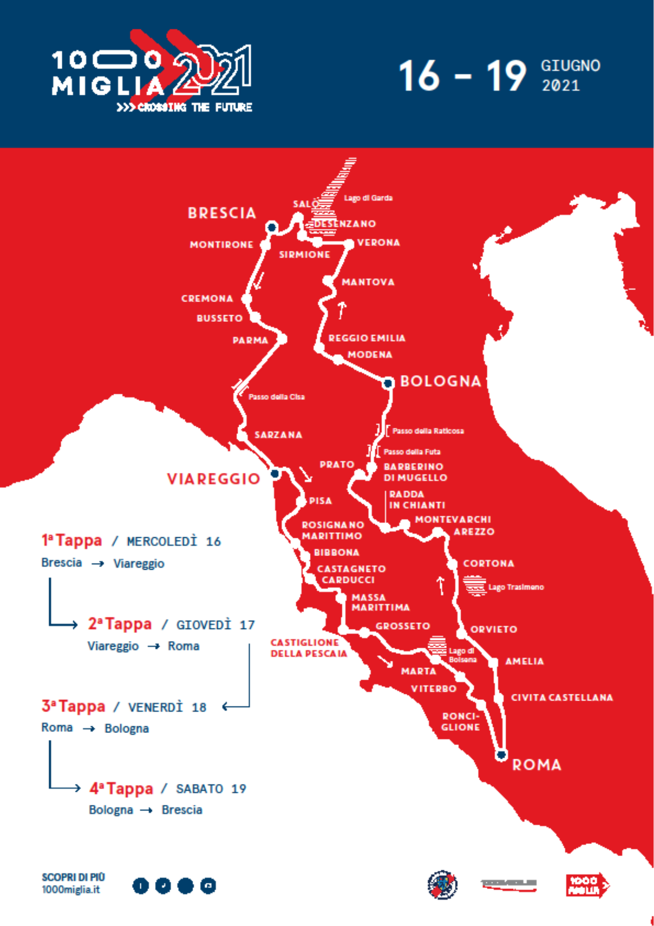 Rispettando la tradizione del tracciato da Brescia a Roma e ritorno – con arrivi di tappa a Viareggio e Bologna – l’edizione 2021 presenterà una novità assoluta per la 1000 Miglia rievocativa: il senso di marcia della gara sarà invertito rispetto alle recenti edizioni, riprendendo il senso antiorario di molte percorsi della corsa originale di velocità. Da Brescia, gli equipaggi faranno rotta verso la costa Tirrenica per sostare a Viareggio, ripartendo il giorno successivo alla volta di Roma. La terza tappa, al via dalla Capitale, risalirà verso nord per concludersi oltre l’Appennino, nel capoluogo Emiliano. La quarta e ultima tappa, da Bologna condurrà fino al tradizionale arrivo a Brescia. Peculiarità che soddisferà numerosi appassionati è un tracciato inedito che porterà gli equipaggi ad affrontare per la prima volta sia il Passo della Cisa, nella prima tappa, che i Passi di Futa e Raticosa nella terza giornata di gara.