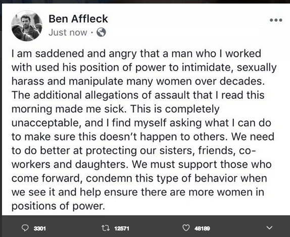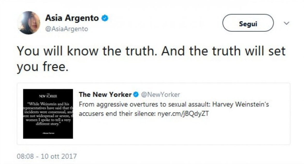 Il caso Weinstein si sta rivelando sempre più esplosivo di giorno in giorno. Il celebre produttore cinematografico Harvey Weinstein è stato infatti accusato di stupri e violenze da numerose attrici, e di giorno in giorno la lista si allunga (Angelina Jolie, Gwyneth Paltrow, Lea Seydoux, Ashley Judd, Cara Delevingne, tra le altre). Anche Asia Argento ha denunciato le violenze, con il paradossale risultato di essere attaccata e insultata sui social, in quanto vittima.