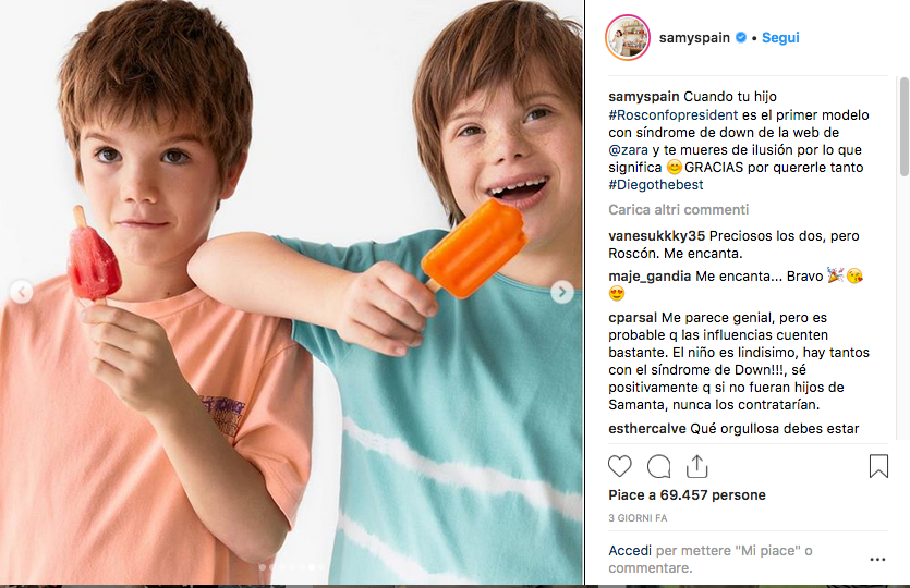 Insieme a Patrick negli scatti della campagna di Zara c’è anche il fratellino Diego. L’impressione che le loro foto comunicano è di gioia, simpatia, spensieratezza. Il pubblico ha apprezzato il messaggio di naturalezza e spontaneità di queste immagini e anche la madre dei piccoli modelli, su Instagram, si è detta orgogliosa di loro: «Quando tuo figlio Roscón è il primo modello con sindrome di Down sul sito di Zara e provi una grande gioia per quello che significa. Con queste foto Patrick ha aiutato tanti bambini che si trovano nella sua situazione». E’ una delle prime volte che il mondo della moda si apre alla disabilità con toni leggeri, del tutto naturali. E le foto di Patrick e del fratellino stanno adesso facendo il giro del mondo, con il loro messaggio di inclusione e ottimismo.
