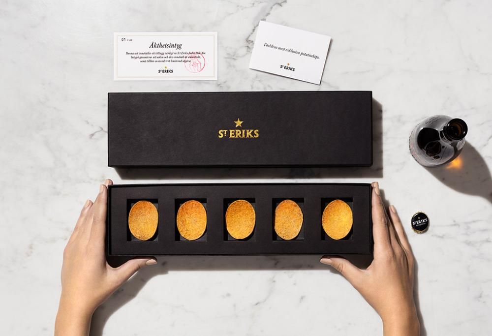 A costare così tanto è un prodotto lanciato da una marca di birre, la St Ericks. Dunque, come potrete desumere, si tratta di patatine alla birra. Una ricetta speciale, studiata dallo Swedish National Culinary Team: pregiate patate della Lapponia aromatizzate con la birra St Ericks. E non è finita qui: gli altri aromi che incrementano il pregio (e dunque il prezzo) del prodotto finale sono il tartufo, le spezie indiane, le cipolle svedesi, i funghi giapponesi e le alghe delle Far Oer.