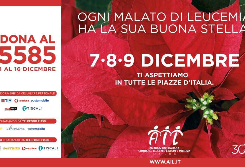 Il 7, 8 e 9 dicembre torna, in 4800 piazze italiane, il tradizionale appuntamento con le Stelle di Natale AIL (posto sotto l’Alto Patronato del Presidente della Repubblica). Promosso dall’Associazione Italiana contro le Leucemie, i linfomi e il mieloma, l’evento solidale (giunto quest’anno alla sua 30° edizione) permette di donare per una buona causa ed è realizzato grazie all’impegno di migliaia di volontari, che offriranno una piantina natalizia, contraddistinta dal logo AIL, a chi verserà un contributo minimo associativo di 12 euro.