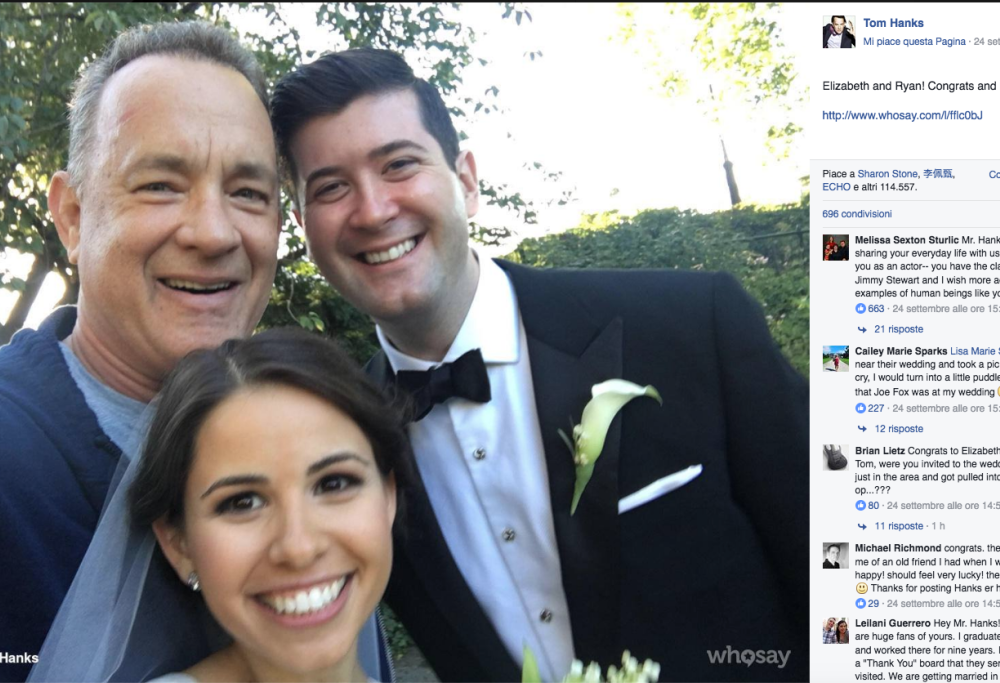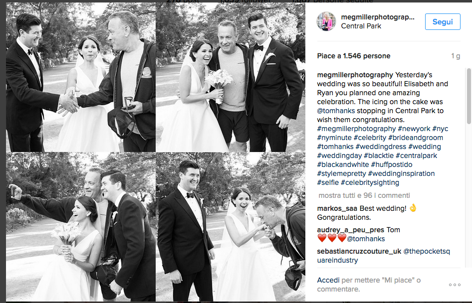 Incontrare Tom Hanks non capita a tutti. Figurarsi poi nel giorno del proprio matrimonio. Se poi l’attore decide addirittura di posare per qualche foto, si può davvero dire che si tratta di un giorno davvero fortunato. Ed è quel che è accaduto a una coppia di sposi, Elisabeth e Ryan, che stavano posando per le foto di nozze a Central Park, New York. A un tratto, in perfetta tenuta da jogging, è apparso Tom Hanks, che ha deciso di regalare ai due un ricordo speciale del loro matrimonio e… ha preso parte agli scatti fotografici. Da perfetto gentiluomo, Tom ha baciato la mano della sposa, si è congratulato con la coppia e ha perfino scattato un selfie. Elisabeth e Ryan a questo punto hanno invitato Tom al ricevimento, ma l’attore si è scusato, affermando di avere già degli impegni. Forse ancora più stupita e felice degli sposi, la fotografa Meg Miller, che ha postato gli scatti sulla sua pagina Instagram.