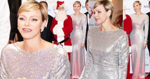 Nell'immagine, il Principe Alberto, la Principessa Charlene e i gemellini Jacques e Gabriella sono in abiti eleganti. ALle loro spalle un sontuoso albero di Natale dalle decorazioni dorate.