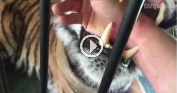 L'uomo protagonista di questa breve clip mette la sua mano in bocca alla tigre come fosse un tenero cucciolo.