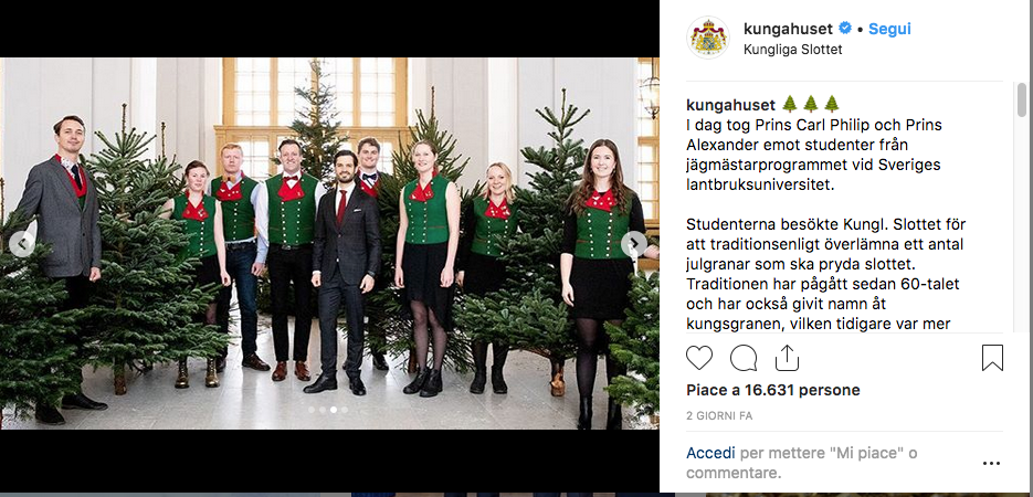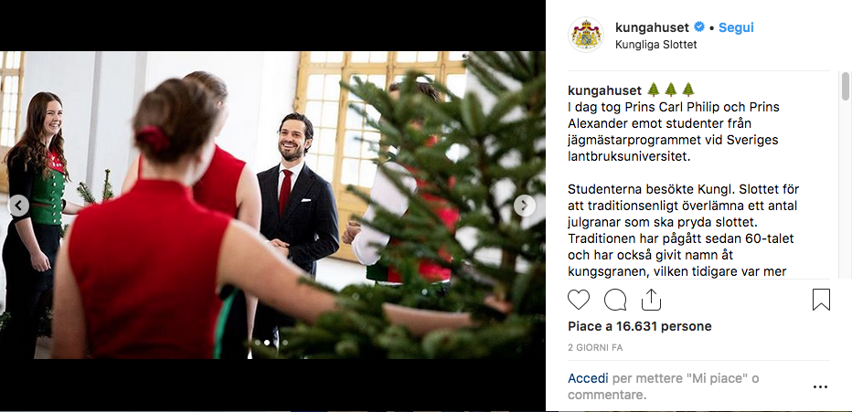 Ora è la volta della Famiglia Reale di Svezia. Bellissimo il video in cui si racconta l'arrivo degli alberi di Natale al Palazzo Reale, Kungliga Slottet. E davvero spontanee e perfettamente riuscite le immagini che ritraggono i componenti della casata, con un irresistibile piccolo duca Alexander (con berretto da Babbo Natale) in compagnia del papà, Principe Carlo Filippo.