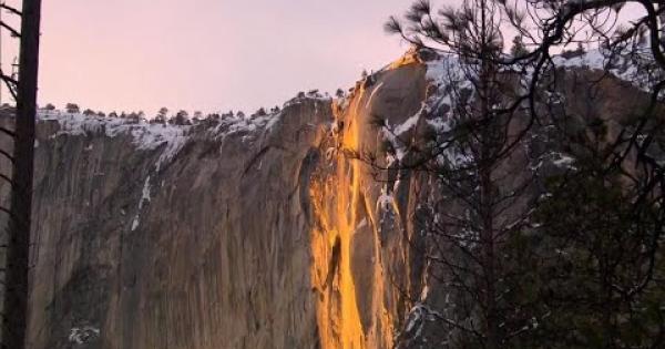 E proprio negli ultimi giorni, nel parco nazionale dello Yosemite, in California, si sta assistendo a qualcosa di sensazionale: dalla cima di El Capitan, una roccia granitica alta 900 metri, sembra che cada un “firefall”, una cascata di fuoco. Si tratta in realtà di un effetto ottico creato dall’abbondante neve caduta nelle settimane precedenti e dai raggi solari del tramonto. La neve spostata dal vento, che cade a picco lungo il versante di El Capitan, viene perfettamente illuminata di un colore giallo-arancio dal sole che tramonta e così sembra che questa suggestiva cascata sia fatta di fuoco.